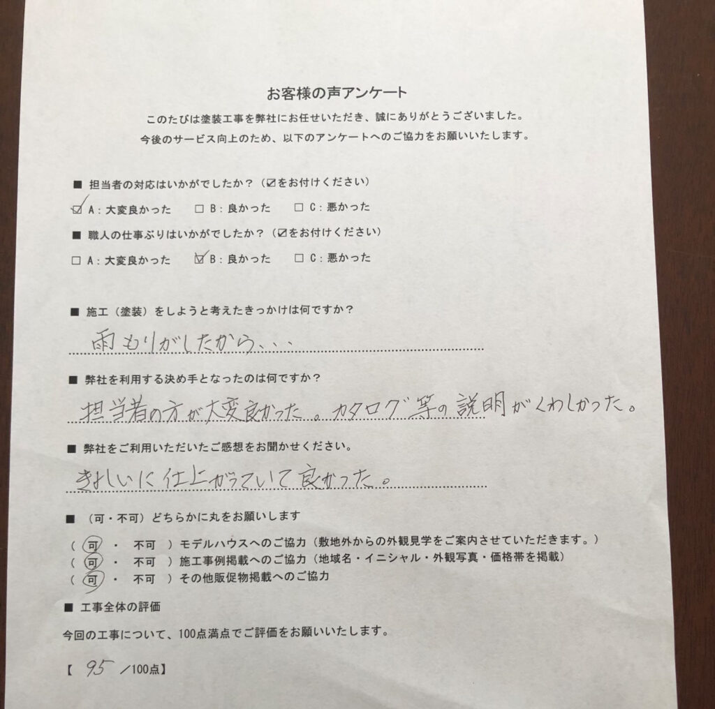 | 使用塗料 | ファインパーフェクトシーラー/日本ペイント/日本ペイント グランセラトップ2液ファイン/日本ペイント ケンエースG-Ⅱ/日本ペイント SRシールH100/サンライズ株式会社 |