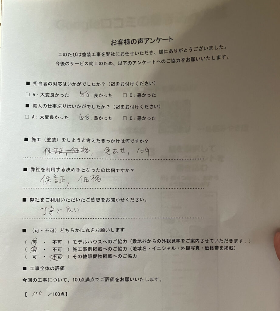 | 使用塗料 | ファインパーフェクトシーラー/日本ペイント グランセラトップ2液ファイン/日本ペイント ファインパーフェクトベスト強化シーラー/日本ペイント グランセラベスト2液ファイン/日本ペイント ケンエースG-Ⅱ/日本ペイント |